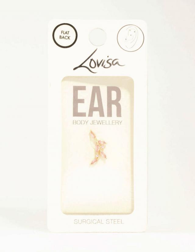 Add a pretty pink touch with this single flat back stud! Crafted from gold-plated surgical steel and featuring a pink diamante accented vine, it’s perfect for some pink glam Material: Surgical Steel, Crystal Colour: Gold, Clear Dimensions: Post Length: 6 mm Gauge: 16g/1.2 mm SKU: 51591939