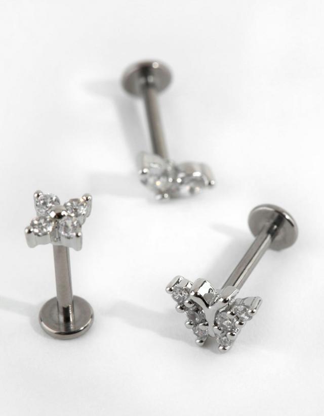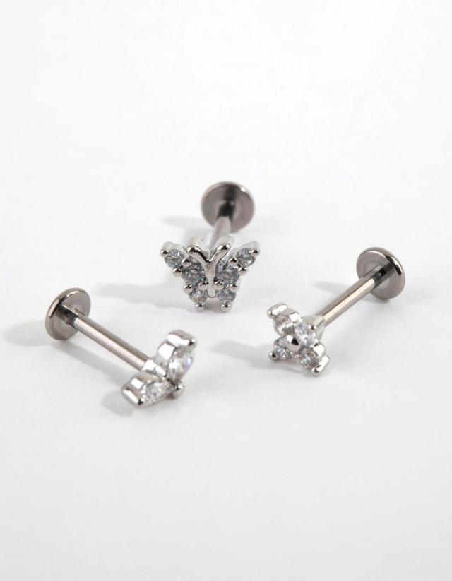 Express your individuality with Lovisa body jewellery! This earring pack includes three studs which have flat backs for your comfort. They’re made with titanium, which is gentle on ears. This pack features a butterfly theme. Each stud measures 16G/1.2mm. Material: Titanium Colour: Silver Gauge: 16g/1.2 mm Weight: 14.8g Suitable for these piercing placements: Cartilage, Lobe, Conch SKU: 51249175