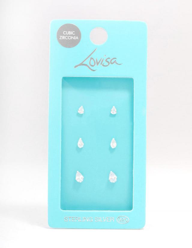 Curate the stack of your dreams with this set of sterling silver studs. This pack includes three pairs of studs, each adorned with graduating sizes of cubic zirconia crystals. Perfect for everyday wear! Material: Crystal, Cubic Zirconia, Sterling Silver Colour: Silver, Silver, Clear Dimensions: Length 7mm x Width 4mm Backing Type: Post Back SKU: 51499051